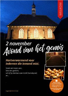 Ook dit jaar wordt de Avond van het gemis in beide kerken georganiseerd. In de Sint-Martinuskerk, Halsteren en de Kerk aan de Voorstraat, Nieuw-Vossemeer